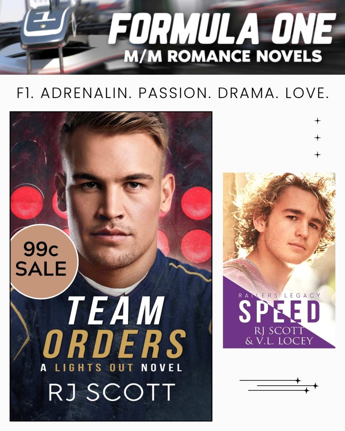 This M/M romance from RJ Scott features teammates, a secret affair, hurt/comfort, and is set in the high octane world of Formula 1 featuring fast cars, driving at the limit, spectacular crashes, heated rivalries, and of course, a HEA.